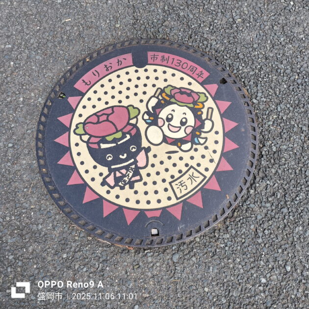 ・昨年東北を回った時に盛岡城周りで見つけたものです。これは、市制施行 130周年記念事業の1つでデザインは盛岡さんさ踊り公式マスコットキャラクター「さっこちゃん」と「わんこきょうだい」の「とふっち」をイメージしたものだそうです。