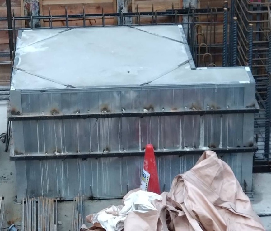 本来は外側から控えの補強をとるのですが、今回は内側に鉄筋がないのでトランパネルの中心から控えを取って施工を行っています。