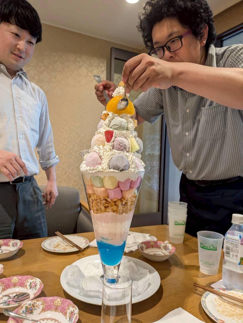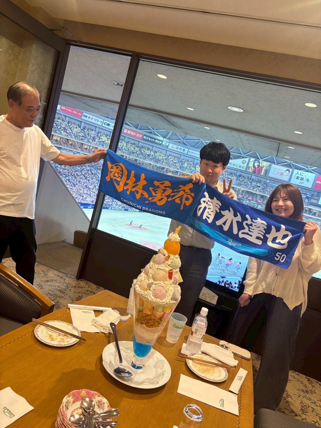 楽しくおしゃべりをしながら野球観戦し、営業部恒例のジャンボパフェをみんなでつついて