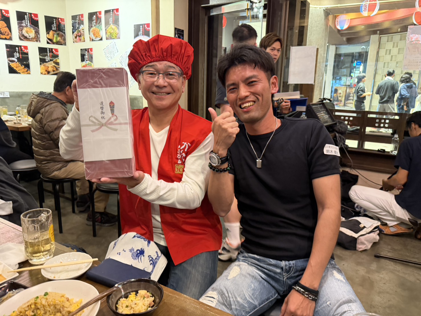 この日、夜の懇親会中にサプライズで専務の還暦祝いを!