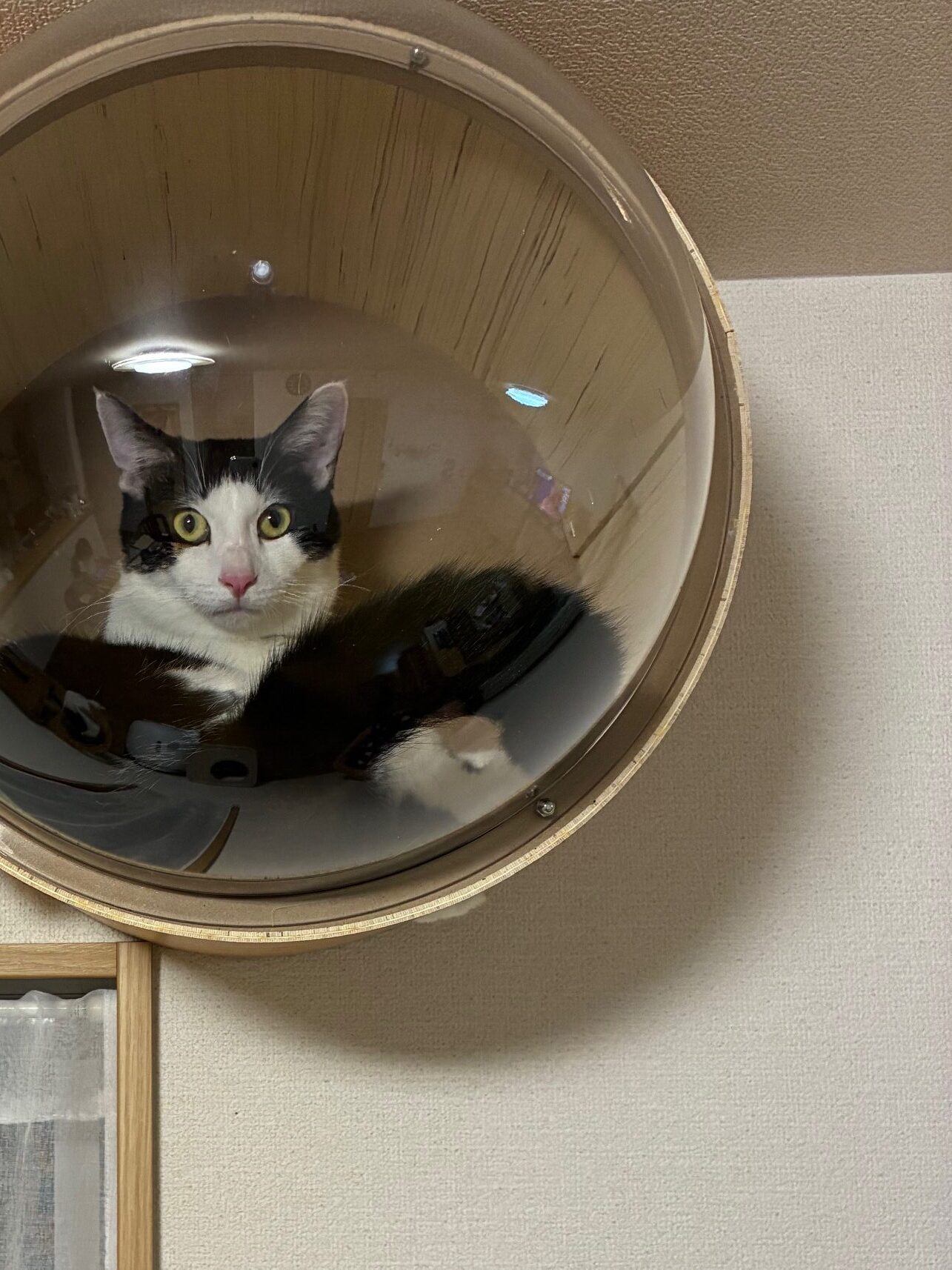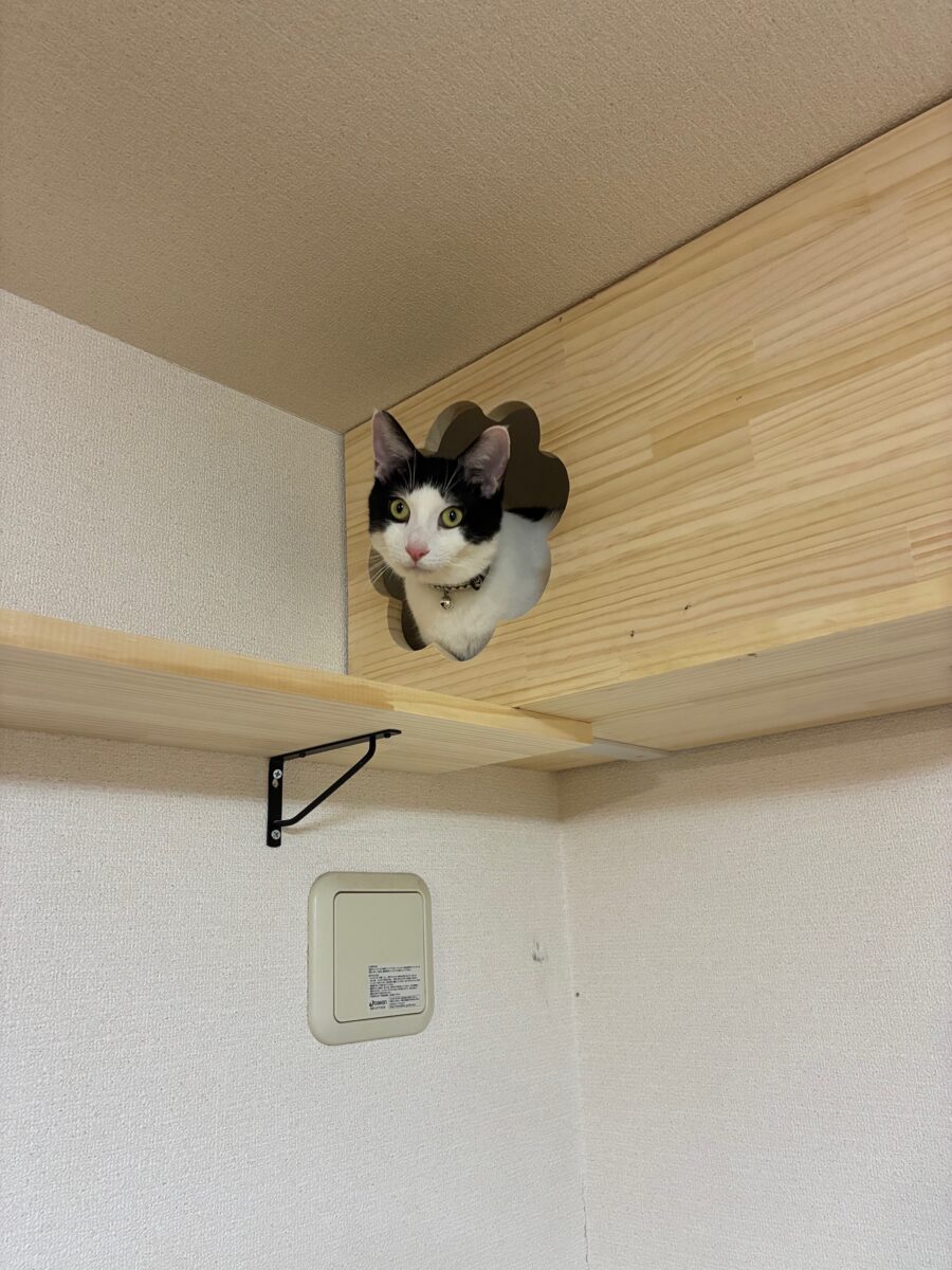 ネコは高いところが好きだからと作った巣箱に入るハッチ