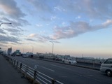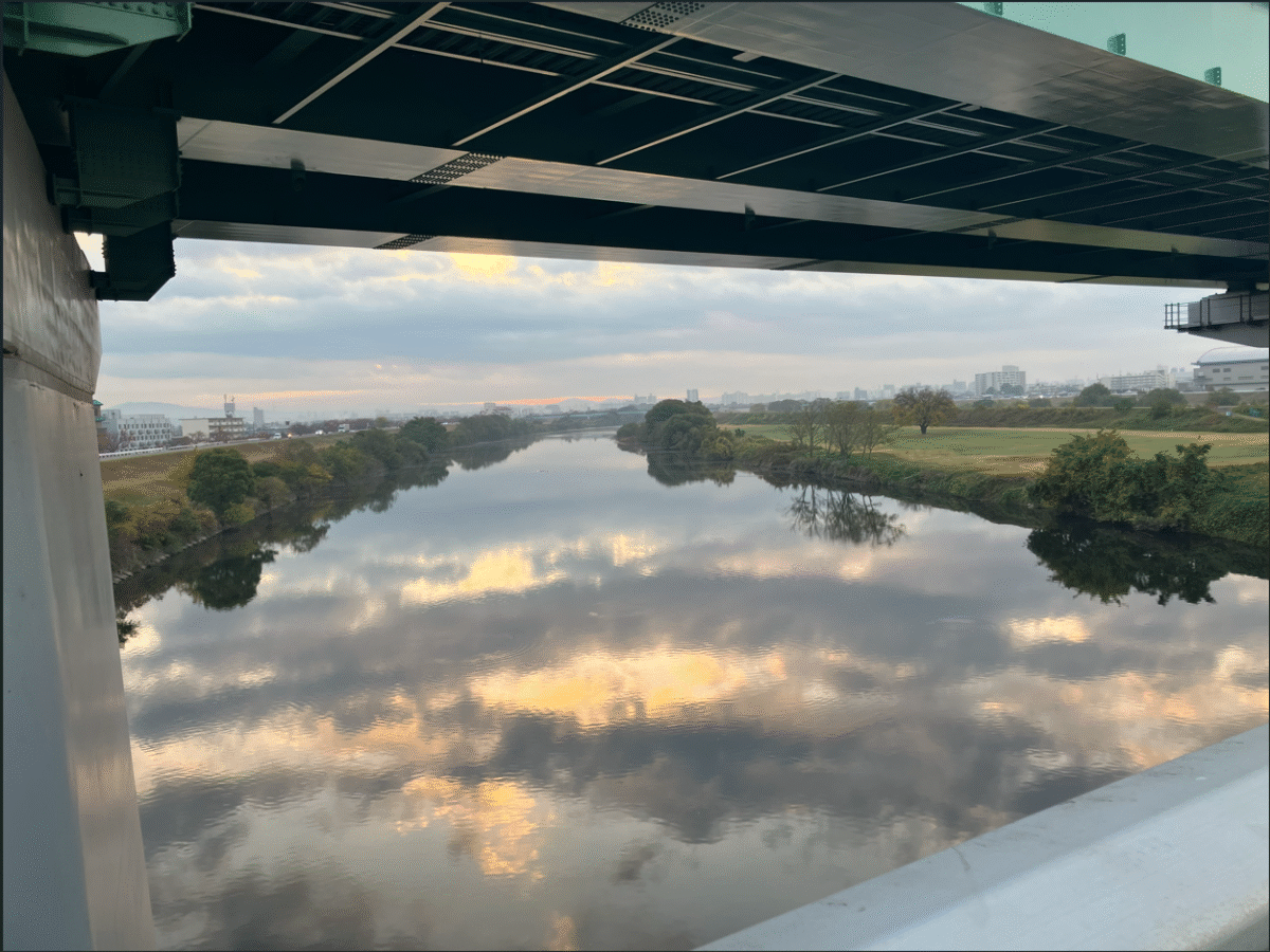 橋の上から左を見ると、川が鏡みたいに光っていた。